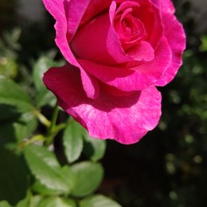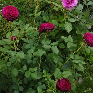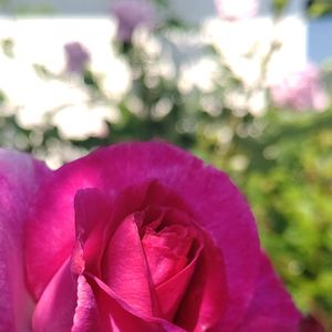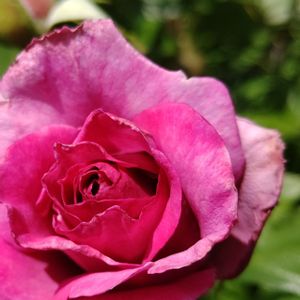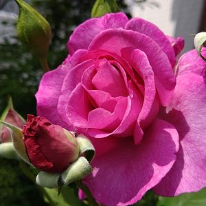 ヴィオレパルフュメ🌹 『フリルがかかった丸弁がキレイに重なる大輪花。グラデーションがかった濃い紫色が鮮やかです。ブルー系の強い香り。育てやすい四季咲き性の中型ブッシュタイプです。 うどん粉病は普通。黒星病に弱い』 と あるけれど 今年は芽かきをしていないので 中輪です。 紫色じゃなく濃いピンク色のような~😅 黒星病は なったことがないです✌️