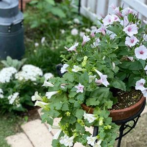 寄せ植えハンギング〜♬ 初めて育てるクフェア『ピンクシマー』💗 ポンポン咲くペチュニア小輪八重咲き『ラベンダー』は花友さんより💜 一つ咲いた『ロフォス』💗 白いアサリナを探していましたが見つからず、ラス1のピンクで我慢…😅