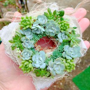 こないだワイヤーで作ったリース こんな感じになりました(OvO) サイズ比較の為わたくしめのおてて(正しくは汚手手)に ちょこんと乗せられております(OvO) 当初セダムのみで作る予定でいましたが色々ぶっ込みました(OvO)はい あいかわらず下手っぴですw 白雪ミセバヤが綺麗な円になればいいのかなw ぶっ込んでる間にズレてくるのですw 綺麗に植えられる人ほんと尊敬します・:*+.\(( °ω° ))/.:+ あと 写真撮ってから気づく... 人工芝どければよかった(OvO)