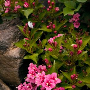 PWワイゲラ トリロジー おととしベビー苗を植え付けて去年は全然咲きませんでしたが、2年目の春を向かえた今年は満開のの開花を見せてくれました✨ホームページの写真で絶対育ててみたいと思い、ホームセンターを何軒も回ってゲットした思い入れ強い品種です😄