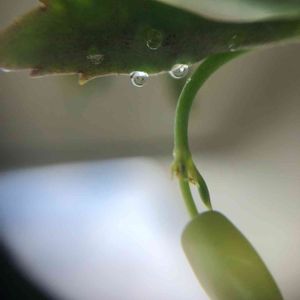 セイロンベンケイソウ 今日は曇り、一瞬豪雨、晴れと忙しい天気です。 数日前から葉っぱに蜜が付いています。 雨ではなく蜜ですよ。 花も一つ二つと気まぐれに着いています。 あまりはから蜜が出る経験はないのですが。。。 葉から芽が出るので"葉から芽"ともいわれますね。