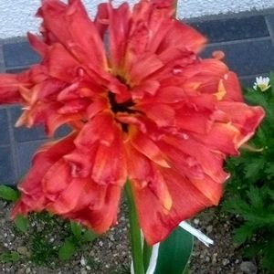 🏷️月曜日は元気色の花 🏷️月曜日にビタミンカラー ① チューリップ 頭が大きく重いので支えて 貰わないと立っていられな いのよ ②③チューリップ 頭重いので起こして貰いま した ④ ゼラニウム どうしてこんな色になった のかしら? お花さんからこんな声が聞こえてきました