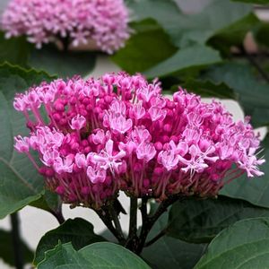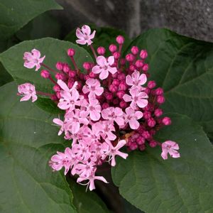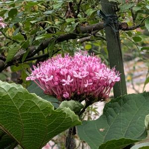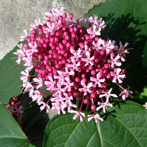 ボタンクサギ シソ科(クマツヅラ科)クサギ属 落葉低木 和名の由来はボタンのようなクサギという意味で、クサギは茎や葉を揉むと臭いニオイがするのでこの名が付いた。 別名はベニバナクサギ、ヒマラヤクサギ、カシミアブーケ、グローリーフラワー 中国南部原産 熱帯、亜熱帯で広く栽培されている。 日本の暖地でも野生化している。 花期7〜8月 高さ1〜2m 葉は対生し、長さ10〜15cmの広卵形で、縁には鋸歯がある。 枝先に集散花序を出し、密に花を付ける。 花は紅紫色→淡紅紫色で花冠は5裂し、花筒部は長さ2.5cmある。 雄しべは4本で長く突き出る。 花言葉は「輝く美しさ」「運命」