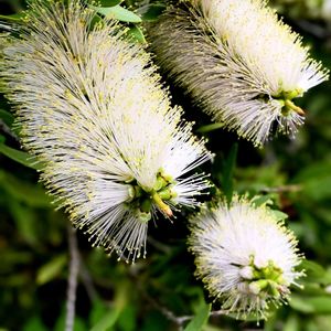 白、ピンク、赤色のブラシノキが並んで咲いています。 白はホワイトアンザック ピンクはピンクシャンペン 赤はドウソンリバー 尼崎市上坂部西公園