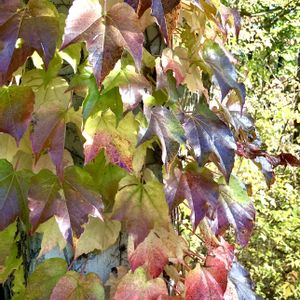 車庫の壁に広がる蔦が 紅葉しています