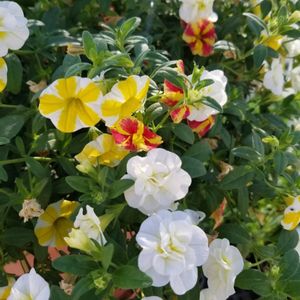タフチュニア ⚪️💛❤️ あふれ咲き 花友さん曰く、雨にも強く、こぼれるように花が咲く!だって😄😃💕