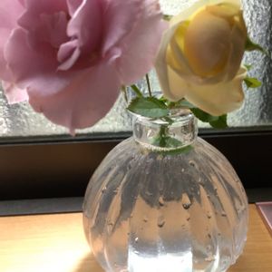 庭に咲いてた薔薇さん2輪いつもの窓辺に飾りました^_^♡ 左のエターナルさん香りが良いです^_^♡ 右は挿木の薔薇さんでお名前がわかりません😅