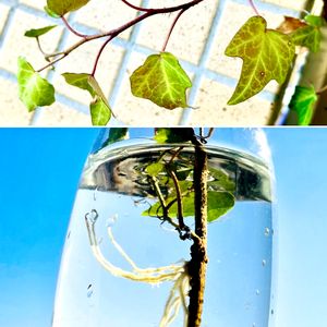 アイビー🍀今日のお花 実家の庭にいっぱいあるので、一枝カット✂️して瓶に水挿ししておいたら、白い根っこが出てきました ちょっと力強く根を伸ばしているので、青空にかざして、撮ってみました🥰