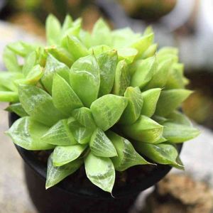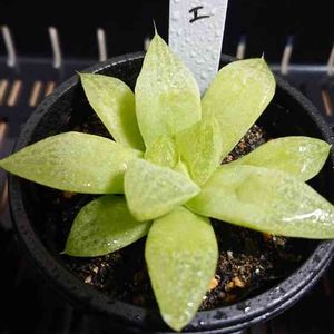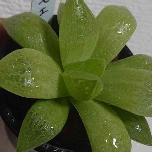 Haworthia cymbiformis ハオルチア 萌 黄緑色が珍しく、目に留まりました。 窓の白い点々も特徴的⁉️ 成長は遅めなのか、時期の問題か、 動きがありませぬ(´・c_・`)