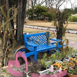 花壇のところに変わった花 (青いベンチの画面右下) まだ、あまり店頭に並んでいない シクラメン イリュージア💗ピンクラテ 寒い中、散歩したかいがあった😊