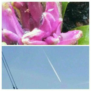 良い天気青空を走ってく飛行機雲がクッキリ✈ ヒヤシンス開き始めたけど、まさかこのチビたまま咲くのか?伸びないのか?