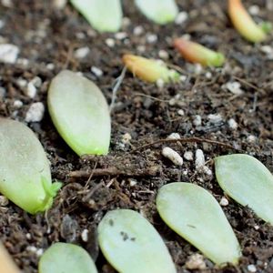 徒長気味葉挿し子。 上ブロンズ姫、下薄氷。 室内葉挿し箱の芽が徒長してきたので根と芽がしっかりしてきたものは昨晩1号のプラスティック鉢に植え替えました。 水をやるべきか、どのくらいやったらいいのかなどまだまだ分からないことだらけです。