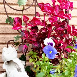 👿ハロウィン寄せ植え🍭(大人版) 10月になりましたね。今回はパープルベースの大人っぽい寄せ植えにしました。 🍬クローバー(ティントナイト) 🍬ビオラ 🍬イレシネ(パープルレディー) 🍬とうがらし 🍬コリウス(迷彩) 🍬カレックス(ブロンズカール) 以前、投稿したコリウスが紫の花を咲かせています😄