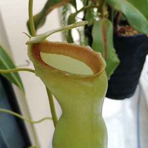 ネペンテス ベントリコーサ 探していたクリーム色のベントリコーサを見つけました。ウチに帰ってよくよく見たらクリーム色じゃない…グリーン💚じゃん(笑) ベントリコーサとしかラベルが無い格安品ですがそれなりに満足です。もう部屋に入り切らないのでネペンテスはお迎えしません!多分😂 薄っすら襟がピンクになるかな?要観察。