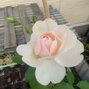 レッチフィールド エンジェルさん⑅୨୧⑅* 1番花は誘引失敗か開きが悪かったから2番花です❁⃘*.゚ 無事に咲いてくれて嬉しい〜 咲いた直後は薄いオレンジみたいですが色が変わり白くなります- ̗̀ ♡ ̖́- 丸みを帯びたシュラブを形成して軽いクローブな香りです𓂃◌𓈒𓐍 この時の色も可愛いので載せました〜 もうこの後、また開いて更にオレンジがより薄くなりましたよ〜 つるバラ初心者の私なので 雨が降ると大変なのが昨年よくわかり 咲くまで心配で心配で傘かけてました(笑) 明日木曜日お休みします〜 今日も穏やかな1日を꒰ •ω• ꒱゚+。:.゚ஐ♡