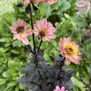 プチダリア ハミング ブロンズ エタニティ🌸 ピンク~オレンジの アンティークな色と銅葉が 大人カワイイっしょ"(∩>ω<∩)"💕 ダリアは冬の保管が難しくて 何個球根を☆にしたかな😅 けど毎年買ってしまいます🥰
