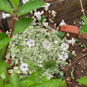 シレネ満開です🎵 今年始めに買ったちっちゃかった苗ですが成長早いですね☺️ ノリウツギの株元で育ってます。縁に見えるのはノリウツギの葉っぱです。去年は花が咲かなかったので今年は咲いて欲しいなぁ😊