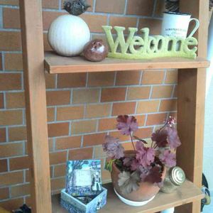 地植えして、弱ったヒューケラを鉢に救済したら元気を取り戻し、はながさきそう! diy で作った玄関の梯子の棚に飾りました。