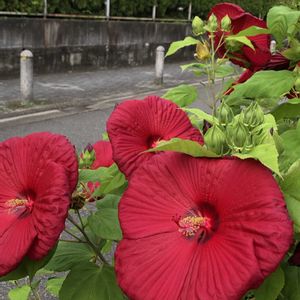 アメリカフヨウ🌺 草フヨウ 舗道の植物 20㎝弱、、🔴🔴真紅の大輪花 今日も暑くなるよー😡🥵