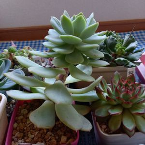 エケベリア「ティッピー×デレンベルギー」 春にチョンパしたい多肉 その③ これは梅雨時期に徒長するタイプ(わが家比)。秋からもち直すのでこんな形になりがちです。 右下のアルケインは綺麗に赤くなってますねー😃
