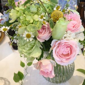 娘が昨日彼からもらったお花🌸 ナニナニ? もしかして、お花の中に指輪でも入ってる? そんな期待も空振り… でもね、可愛いお花でテーブルが明るくなりました😊💕💐