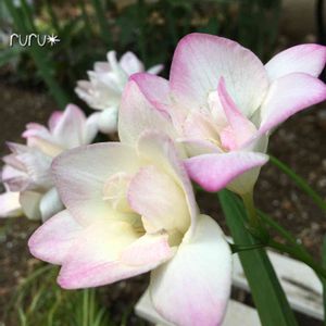 白いフリージア ほんのりピンク色の縁取りが可愛いなあ💕