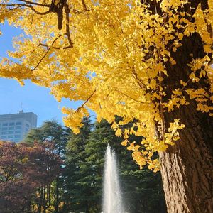おはようございます☺️ 都内散歩の最後に日比谷公園に寄りました😉 大きな銀杏と噴水⛲ 野音小音楽堂~ ビルと洗練された植樹 真っ白な山茶花♡ 銀杏🟡の絨毯撮ってたらタデ科かな~ 可愛く顔出してました🎵 今月は銀杏の葉で 発表会参加です♪