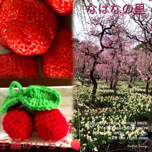 こんにちは.。.:*・゜今日は🍓の日.。.:*・゜ 🍓に見えますか?手編みのいちご 笑 さくらんぼにも変身 なばなの里の画像 昼から友達から送られた画像です 毎月15日はいちごの日に参加させてもらいました.。.:*・゜