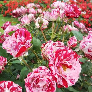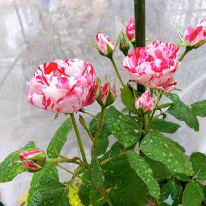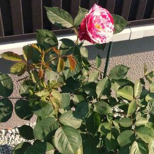 赤と白のくっきりした絞り模様がとても美しい🌹バラ🌹の「アラベスク」と言う品種です✋ 丸弁、八重咲き、房状に花をつけます🎶