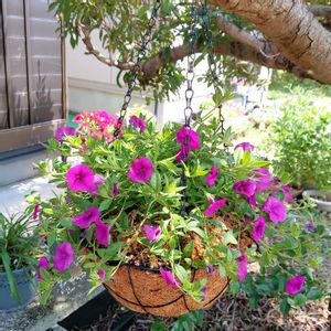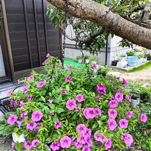 ハンギングバスケットのカリブラコアがだいぶ茂ってきました