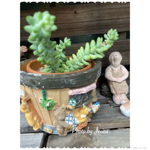 変わった形の お気に入りのポットに 寄せ植えしてみたよ 《若緑とカリッシア》 カリッシアは 別名シグレツユクサ