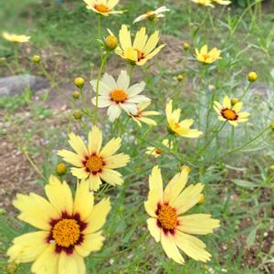南側斜面の荒地🪨 もう一箇所植えたコレオプシス🌼沢山咲いてきました! "レッドシフト" と "フェアリーホワイト" パッと見は同じだな、、🙂笑 6/29参照📝 スタークラスターより背が高くて、こちらのがコスモスっぽいです。スタークラスターのがギュっとまとまって咲いてます( ⚯̫ ) 今の時期、畑で毎日野菜が採れるのは有難いですが 毎日キュウリとナスとトマト地獄😂🥒🍆🍅