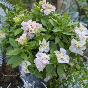 八重のペチュニアをいくつか🌱✨🌱✨ Page1…ティーパーティー・ルフナ&ジャメスブリテニアと共に…✨ 当家絶賛のセール品100円コンビです🤩✌️ ホントにタイミング良くお迎えできたも んだ!!って喜びに浸ってます🎶🎶 Page2…ホイップマカロン・クラシカルチェリー🍒 単体での美しさはホイップマカロンのプレミアムカラーが1番だなぁって勝手に思ってます🌱✨✨ たった一輪咲きでも絵になります🖼️✨✨ Page3…ミンティパフ🌿 よく咲くわよねぇ…このペチュニア😉…って感じで次々にもこもこ、もりもり咲いてくれてます👍 爽やかな色みが夏にマッチします🏖️🎶 Page4…ベルチャーム・クロエ💐 ベルチャームは切り戻してもしっかり再生してくれるので嬉しいですね😉🎶 過湿にならないようにだけ気をつけてます🤔(他の八重ペチュニアもですが🚰) Page5…アルテミス🌟 ゲブラナガトヨの八重ペチュニアです。 切り戻しからだいぶお花が咲いてきました〜🎉 なんと言ってもちょっと和テイストを感じる花柄が美しいです🇯🇵✨ ベルチャームほどではないですけど、切り戻しからの復活もしっかりしてました🌱🎶