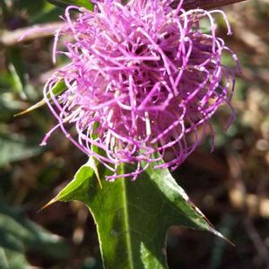 キンカアザミ(金華薊) *キク科アサザ属 宮城県牡鹿半島、金華山島の特産 葉が羽状深裂して糸のように細くなり 中型の頭花を上向きに咲かせる 葉は茎を抱く 恐ろしほど硬いトゲが発達している。 この辺りは、鹿が多く生息していて その食害に対する防御と考えられている (11月22日撮映) 宮城県牡鹿半島 御番所公園付近
