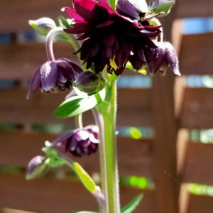 オダマキ ブラックバロー (キンポウゲの宿根草) どこからか⁈ 我が家に住み着き 4年目 我が家の空き敷地は無いので お隣さんとの境界線ギリギリの裏へ回る砂利道を占領 たいして日当りも良く無いのに 仲間を増やしながら一列整然とお行儀良く並んでいます 裏へ行く時は 飛び飛び歩ける様 隙間が均等に有るのも不思議❣️ 邪魔にもならず同居しています モジャモジャ頭のアフロ族、、、、、、と勝手に名付けて楽しんでいます 実際はもっと黒みがかっていますが 何回 撮っても赤っぽいです 📱向けられると恥ずかしい〜🫣のかなぁ、、、、、、 2025.6.4 全コマ同日撮影