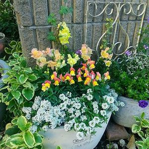 こんばんは😃🌃✨ 朝晩は少し寒くなってきました🥶 アリッサムとキンギョソウの寄せ植えを作ってみました💠 真ん中は高さが25センチまで、奥が35 (40?) センチまで育つそうです。