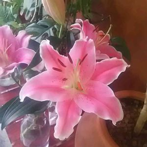 7/9(月)③ ☆百合 ピンク色☆ ☆☆二つ前のpicの右上↗️のピンクの百合です。 アップだと高さや向き分かりにくいですよね😅すみません💦 あれから🔍調べてみました。 ☆☆スカシユリは上向いて咲く。高さは15cm~75cm。花は8~15cmの大きさ。 ☆☆ユリは横向きに咲く。高さはスカシユリより高い。このピンクの百合は1m以上ありました。花は15cm~20cmはあったように思います😮