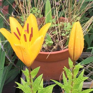 おはようございます😃 今朝のお花は2日前から咲き始めた百合です🎶 こちらは去年の秋に花菖蒲を植え替える時、土に埋まってたのを発見し、鉢に植えてたものです。義母が植えてたのかな⁇ そこに百合が咲いてたのを覚えてません😅 私が花壇に植えてるのと似てるので品種はスカシユリでしょうか⁇