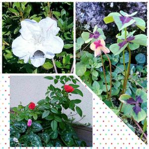 アザレア(ツツジ)が、また咲きだしました😆 ラッキークローバも紅葉? ミニ薔薇とガーデンシクラメンに、ゲンノショウコ(現の証拠)が写り込んでます😆 ゲンノショウコは1日咲きです。儚いわ😖