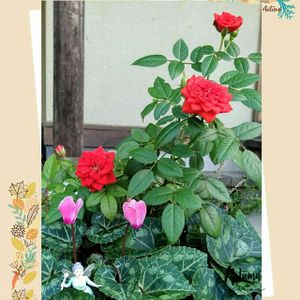 🏷水曜ローズショウに参加します🌹 家のミニ薔薇は、一度に咲きませんが蕾も付け、ガーデンシクラメンを引き立ててくれてます💕🤗 去年の10月にお迎えした物です💕