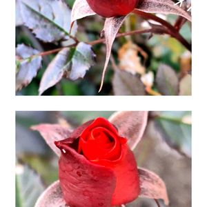 突然の寒波に…… 咲き始めた薔薇が このフォルムのままフリーズ けなげで愛おしい🌹 負けないで