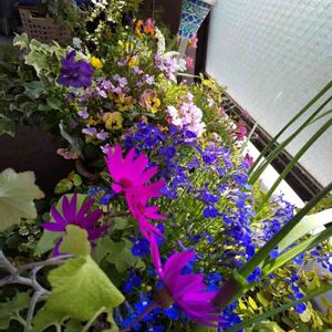 2020/04/25 北側ベランダガーデニング〜…(*˘︶˘*).。.:*♡🍀❣️💠💜🌸💛🌼✨…💞 ミニバラ🌹 ミニシクラメン ラベンダー…💜 ユリオプスデージー サイネリア・セネッティ… キンギョソウ ビオラ…💞💠 ラベンダー…〜…💜💠❣️ 何処まで伸びるの〜…