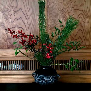 "ザ・ペニンシュラ東京"1階エレベーターホールの装花。 今日のお花「センリョウ」の赤い実が、迎春のアレンジに色を添えていた。