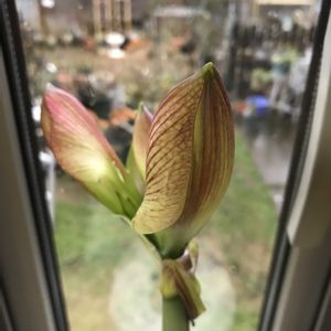 アマリリスダブルドラゴンが咲き始めました。 アマリリスの蕾は水鳥の伸ばした首と頭のようで生き物みたいといつも思います。 玄関先に出していると、大きな花が遠くからでも目立つようで散歩途中の方や布教活動中のお花好きの方に声を掛けられます。 平日、夫が尋ねられても花の名前は答えられなかったらしく…教えておきました。 アマリリスアップルブロッサムは普及種のようでよく育ち分球した球根も生育が早く花をつけました。場所を取るので花友さんに貰っていただきました。 私は冬家に取り込んでいるので今咲いていますが、外管理の花友さんはまだ咲いていないそうです。雪や、寒さに当てても枯れていないようでビックリです。