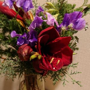 今日のお花 アマリリス ①ロイヤルベルベット 数年前、お教室で習ったブーケ ②職場のお庭のアップルブロッサム ③街路樹の根元で、道路の方を向いて咲いているのを見つけた ④我が家のアップルブロッサム ⑤室内で撮ったらモノクロ風になっちゃった