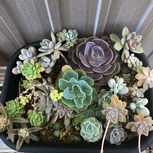 おはようございます。 ロウルサンコさんでラッキーゲットして、詰め込んだ鉢。 1年たって、いなくなった子もいるけど育ったなぁ🤣 🏷suzuと寄せ植えで過去pic見れます✨