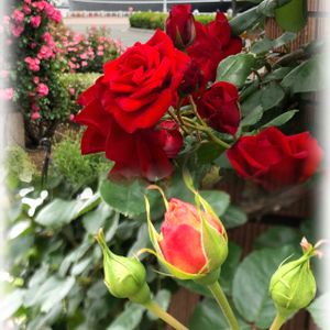 🥀紅玉(こうぎょく) Rosa‘Zentukou’Kougyoku 花色:濃赤色 花形:カップ咲き 花径:2cm 開花期:返り咲き性(春と、夏または秋に開花) 樹高:伸長250cm 樹形:つる性 香り:微香 用途:鉢栽培、壁面、オベリスク・ポール、アーチ 🌹紅玉はコロコロとした愛らしい花が一面に咲くツルバラ「珠玉」の枝変わりで、花色が濃赤色です。「珠玉」とほぼ同質の性質を持ち、球状の深いカップ状の花は大房になって開花し、花付きがよく花もちがとてもよいです。花色が濃いためか、「珠玉」と同じ大きさの花を咲かせますが、ひと回り小さく見えることもあります。花枝が短いため構造物から枝が突出することがなく、また花枝もまんべんなく出るので、株全体ににぎやかに花が咲きます。春以降は気ままに返り咲きます。枝は細めで比較的しなやかなため、誘引しやすいです。黒点病に強く樹勢も強く初心者にも育てやすい品種です。品種名は「珠玉」に合わせて命名。日本・河合伸志 作出・2011年 2020.11.23 山下公園