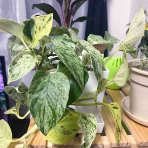 母がコーナンで見つけたポトスのマーブルクイーン。 見たのも初めてだし、調べてみたら上級者向けなんだそう😭 大丈夫かな? とりあえず水やりは控え目にして障子越しの柔らかな光で育ててみる🌱 名前もすごいから、つい過保護になっちゃう~💐