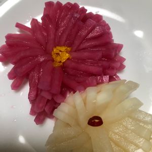 こんばんは⭐️ 今日の花 カブ🎶 菊花かぶ、紅白で作ってみました❤️🤍 赤は、ローゼルの甘酢漬けの漬け汁に漬け込みました💗花芯には柚子の皮を刻んだものを💛 お節料理ではカブがなく大根でも作ってみました。 見た目変わらずカブの写真だけにしました! お味は大根だとちょっと苦味がありカブのが美味しかったです💗 今年初めてピンクのカブ、「もものすけ」植えてます💗まだ収穫してないので、収穫したらUPします💞