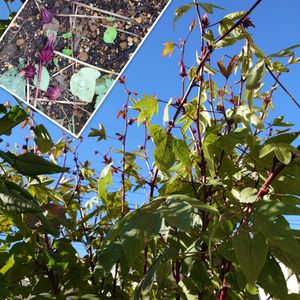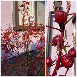 おはようございます☀️ 今日もあったかそうです🥰 ローゼル今年最後のお姿を❣️ 紅葉した葉っぱ✨ パンパンに実った種?! 名残惜しいけど収穫してお終いにします。